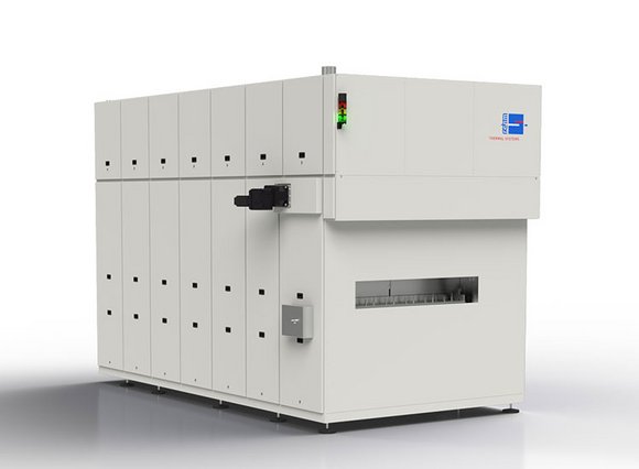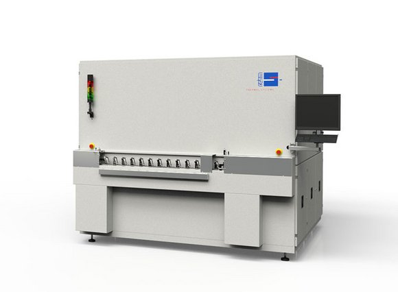 Nicht weniger platzsparend arbeitet der RDS Magazintrockner von Rehm Thermal Systems. Weder als Vertikaltrockner konzipiert noch mit Schlaufentransport ausgestattet, wird die Anlage – von Hand oder mittels Handlingsystem – mit mehrfach bestückten Magazinen beladen, die anschließend in die Heizzonen gelangen. Dort erreicht das System Temperaturen bis 300 °C sowie Restsauerstoffwerte kleiner 5000 ppm O2. Eine optimale Wärmedämmung sorgt indes für ein stabiles Temperaturprofil im Prozess. Damit eignet sich der Magazintrockner besonders für Powermodule und Hochtemperaturanwendungen bzw. die thermische Behandlung von Halbleiter-Applikationen, Hybrid-Aufbauten und elektronische Baugruppen wie sie in Windkrafträdern, Elektroautos oder im Solarbereich zum Einsatz kommen.