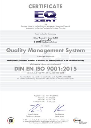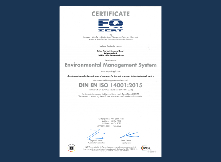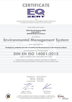 Rehm Thermal Systems has been regularly certified in accordance with DIN EN ISO 9001 since 2004. We also plan and design all machines to be CE-compliant in accordance with machine guidelines. We are regularly certified in the energy audit according to DIN EN 16247-1 and have also set another milestone towards climate neutrality with the introduction of the environmental management system according to DIN EN ISO 14001:2015 at Rehm Thermal Systems GmbH.