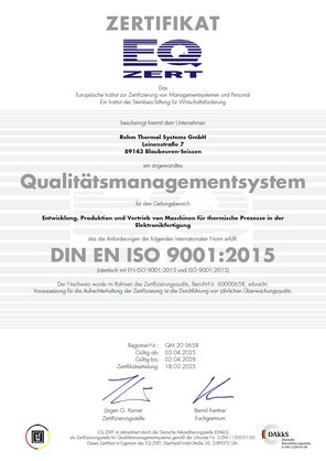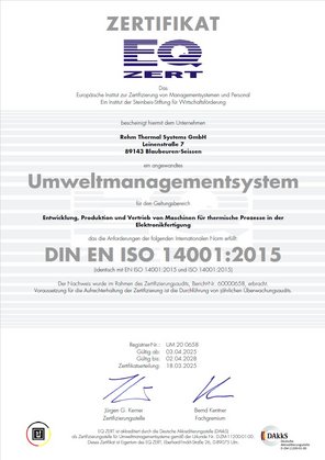 Rehm Thermal Systems wird seit 2004 regelmäßig nach DIN EN ISO 9001 zertifiziert. Alle Maschinen planen und konstruieren wir außerdem CE-konform nach Maschinenrichtlinien. Regelmäßig werden wir im Energieaudit nach DIN EN 16247-1 zertifiziert und haben auch mit der Einführung des Umweltmanagementsystems nach DIN EN ISO 14001:2015 bei der Rehm Thermal Systems GmbH einen weiteren Meilenstein in Richtung Klimaneutralität gesetzt.