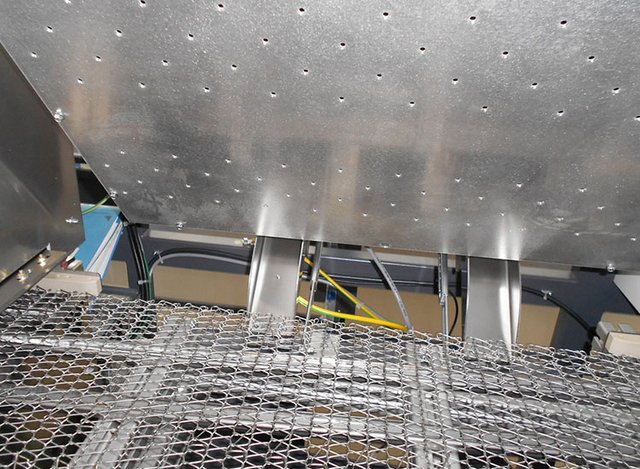 Die Kühlzone besteht aus einem Düsenfeld über das gleichmäßig kalte vorgefilterte Luft auf das Produkt strömt. Eine optimale Kühlung ist aufgrund der optimierten Strömungsverteilung gewährleistet. Je nach Anforderung wir die Kühlstrecke den Kundenanforderungen angepasst und kann mit optionaler Wasserkühlung Produkt-Auslauftemperaturen von <= 40 °C erreichen. Grundsätzlich sind die Kühlstrecken klappbar ausgeführt und somit leicht zugänglich und einfach zu reinigen.